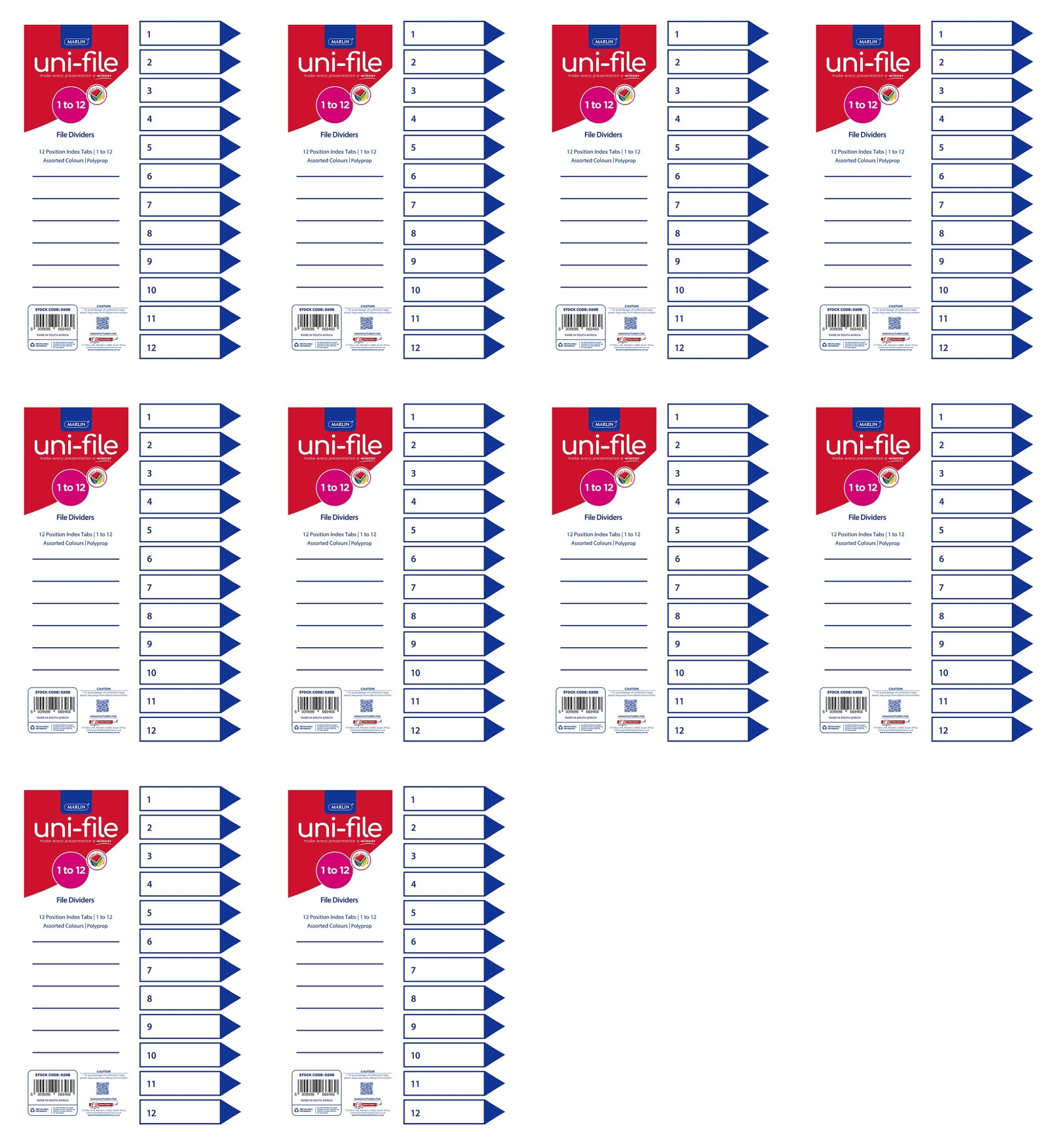 Marlin File Dividers / Indexes Polyprop: 12 Position Printed 1-12